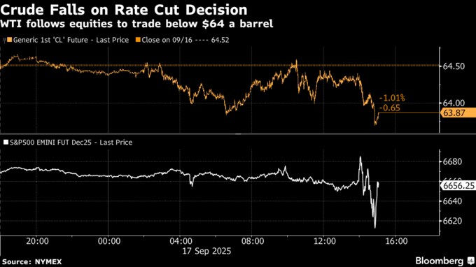 利下げは通常、エネルギー需要を押し上げるが、労働市場が一段と弱まっているという当局の警告が意識された。ドルがやや上昇したことも、ドル建てで取引される商品の魅力減退につながった。