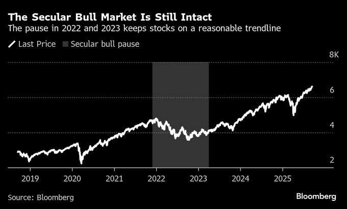実際、22-23年の利上げで循環的な弱気相場が訪れたものの、S&P500の20年の安値からのトレンドラインはそれほど悪くは見えない。