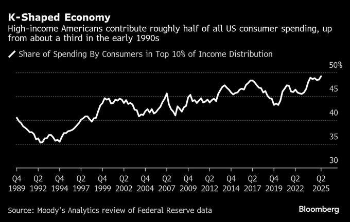 一方で高所得世帯は、住宅価格の高止まり、AIブーム、安定した利子収入、株価上昇の恩恵を受け、事実上経済を下支えしている。