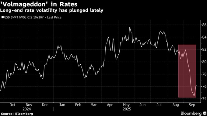 テクニカル要因も背景にあると考えられるが、米利下げ継続がリスクテーク意欲と景気を支えると期待が広がる中で、株式や為替を含む市場全般でボラティリティーは広く低下した。連邦準備制度の独立性を巡る不安が和らいだことに加え、米財政赤字もそれほど注目されなくなったようだとバークレイズのストラテジストらは指摘した。