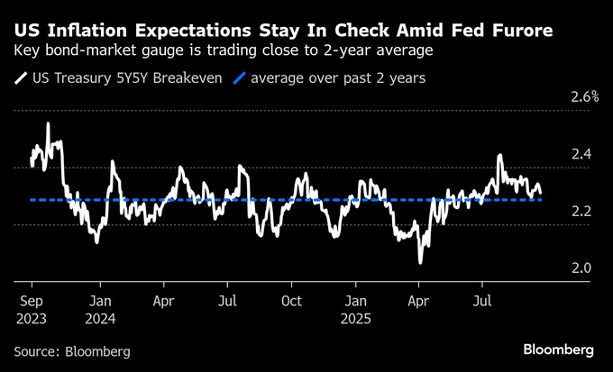 中央銀行の独立性が揺らぐことによる最大のリスクはインフレ高進だとされるが、米国のインフレ期待は7月のピークから低下し、直近2年の平均水準とおおむね一致している。