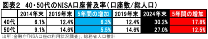 前出の「NISA 口座の利用状況調査」によれば、2024 年末時点では 40~50 代が口座数の39%、残高の41%、年間買付額の42%を占めた。これらは、人口構成比の 32%を大きく上回る。