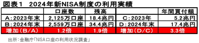 実際、金融庁の「NISA 口座の利用状況調査(2024年12月末時点の確報値)」で新NISAの利用実績を見ると、口座数や残高、年間買付額のいずれも、改正前の2023年から大きく伸びている。