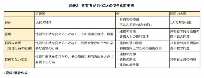 しかし、売却や賃貸といった不動産の「変更」には共有者全員の同意が必要であり、単独所有と比べて「所有権」の行使には一定の制限が伴う。共有者の数が増えると共有者間の意見調整が難しくなり、不動産の活用が停滞する恐れがある。
