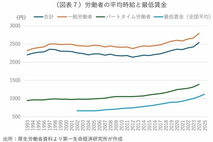 人口減少による人手不足の更なる深刻化が予想され、今後も賃金上昇が続く可能性が高い。政府は2020年代中に最低賃金(時給)を1500円に引き上げることを目標に掲げている。