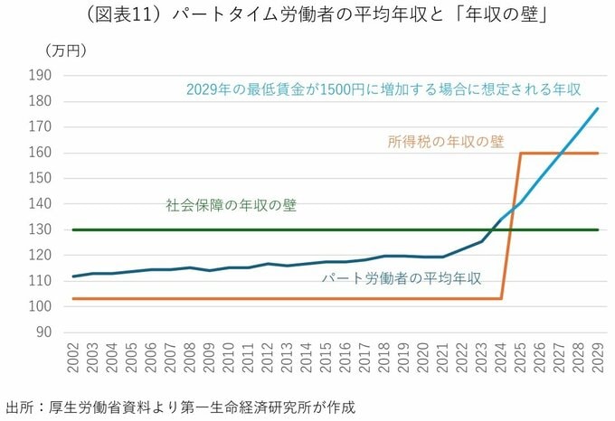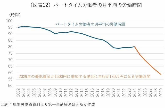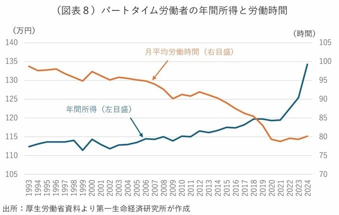既に2024年のパート労働者の平均年収は130万円を超え、更なる賃上げは労働時間の一段の抑制につながる可能性がある。