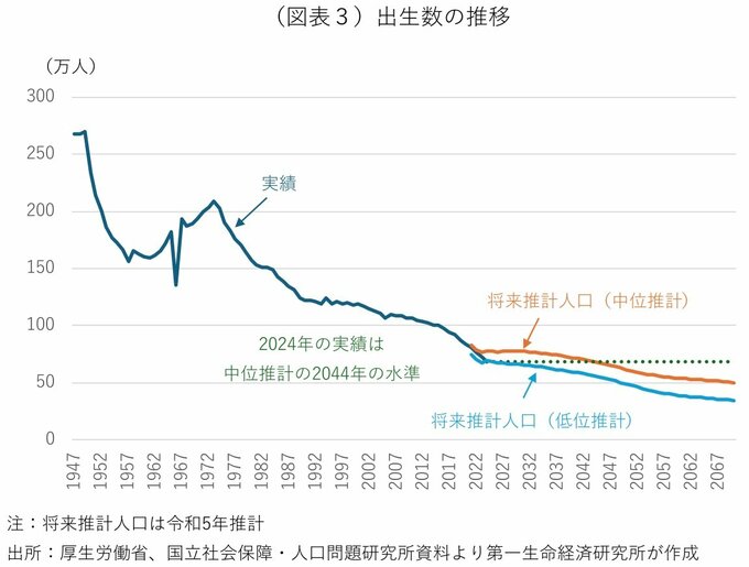これから出産年齢に差し掛かる女性が生まれた2000年以降、出生数の減少が一段と加速しているうえ、2024年の合計特殊出生率は1.15と過去最低を更新した。政策支援で出生率の低下に歯止めが掛かったとしても、今後生まれる子どもが平均的な初産年齢に達するのは約30年後のことだ。今後も人口減少が続くことは避けられない。