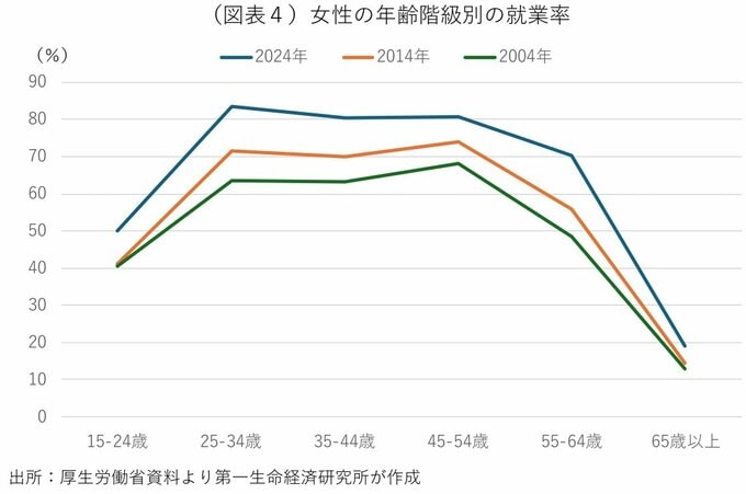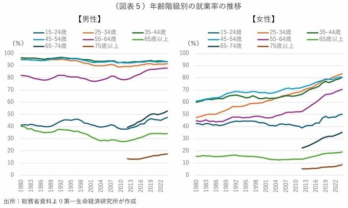 定年延長や定年後の再雇用で働く男性が増えたことに加えて、女性の就業率が全ての年齢層で高まっている。