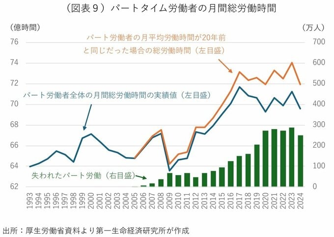パート労働者の平均労働時間は20年前と比べて約16時間減っており、労働時間を抑制しなかった場合と比べて、約250万人分のパート労働が失われた計算となる。