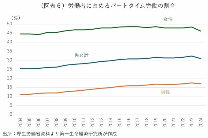 現在、女性の半数近くはパートタイム労働者として働いている。男性の労働者に占めるパート労働者の割合は20年前の約11%から過去数年で17%前後に上昇しているが、女性のパート比率は過去15年余り、40%台後半でほぼ変わっていない。