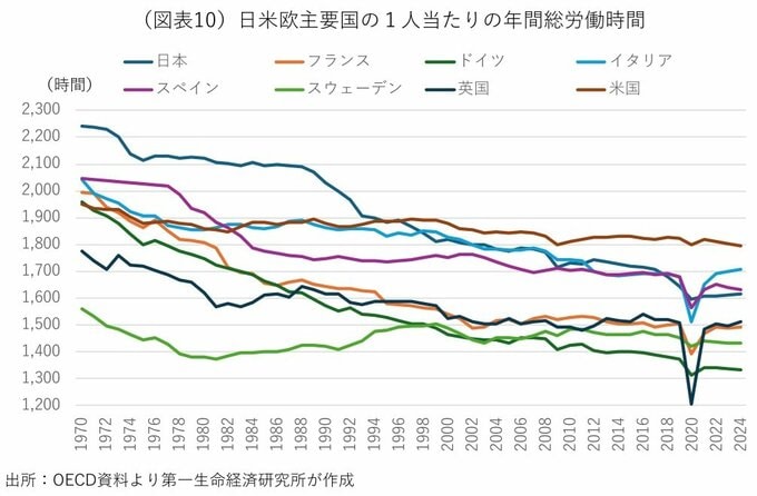 日本の労働時間は減少傾向が続いている。かつて2000時間を超えていた1人当たりの年間総労働時間は現在、約1600時間にまで減少し、米国、イタリア、スペインを下回っている。