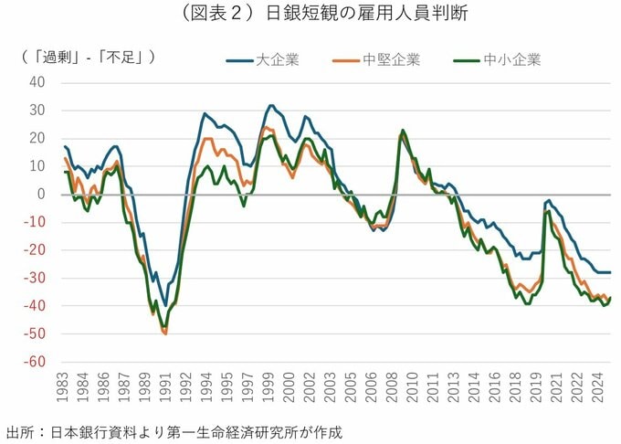 大企業よりも中堅・中小企業、都市部よりも地方の人手不足が深刻で、建設、運輸、宿泊・飲食、介護などの現場で人材確保がとりわけ困難な状況にある。
