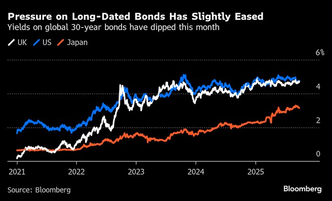 米国と日本の30年債利回りは9月上旬から約20ベーシスポイント(bp)低下し、英国債は10bp余り低下した。主要国の国債市場を揺るがす大規模な売り局面では、日本の長期国債利回りは過去最高水準に、英国債は1998年以来の高水準に達していた。