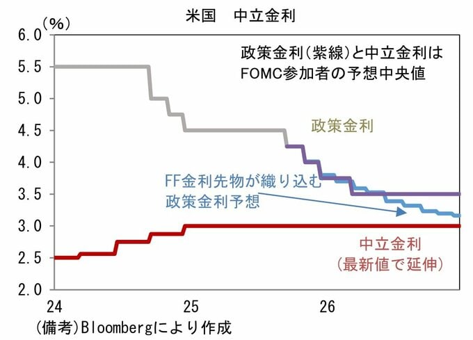 他方、FF金利先物は、2026年後半に3%強の水準(概ね中立金利)まで利下げが進む展開を織り込んでおり、ドットチャートで示されているよりも積極的な利下げが想定されている。