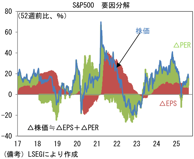 事実、現在のPERは23倍程度とコロナ期(2020年後半)の頂点すら凌駕する水準に押し上げられており、S&P500の変動をEPS要因とPER要因に分解すると、PER要因の寄与が目立っている。