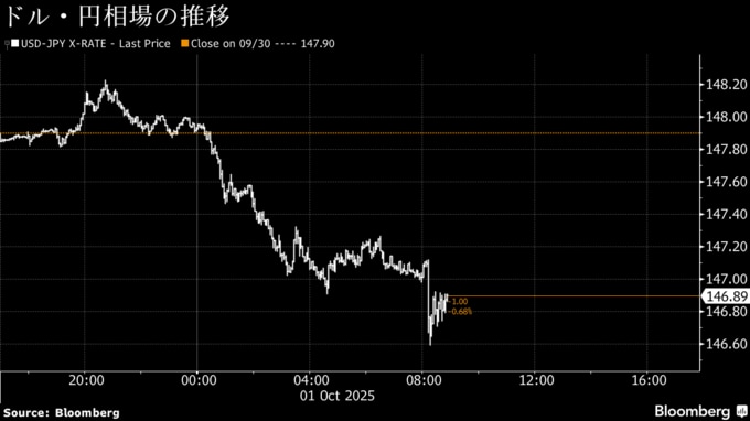 外国為替市場では、円がデータ発表直後に対ドルで上げ幅を拡大。一時146円60銭付近まで買われた。