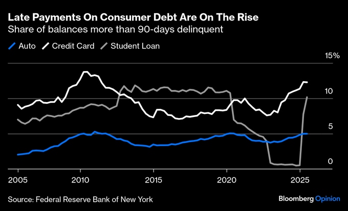 他の消費者債務の現状も不安に映る。延滞が90日を超えるクレジットカード残高の割合は12%を突破した。20年のピークを大きく上回り、10年の13.7%に近づいている。学生ローンの延滞もコロナ禍後に猶予措置が終了したことで急増した。