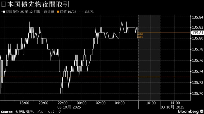 先物夜間取引で12月物は2日の日中取引終値比8銭高の135円81銭で終えた。2日の米10年国債利回りは前日比2ベーシスポイント(bp、1bp=0.01%)低い4.08%程度で引けた。米スワップ市場が織り込む年内の利下げは1.9回程度。