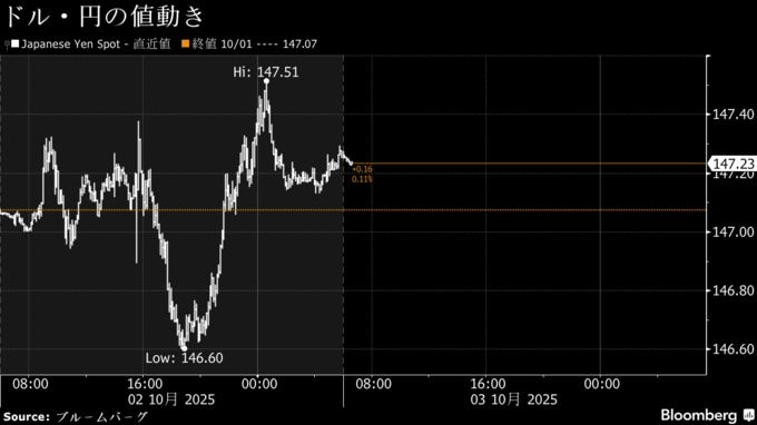 (ブルームバーグ):3日朝の外国為替市場の円相場は1ドル=147円台前半と前日夕からやや下落して推移。米国で政府機関の閉鎖を受けたドル売りが一巡して買い戻されている。日本銀行の植田和男総裁の発言に注目が集まる。