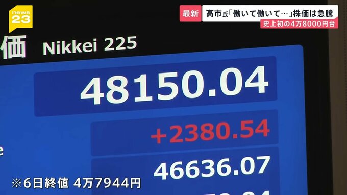上げ幅は一時2300円を上回り、 取引時間中の最高値を更新。 史上初めて一時4万8000円台を突破しました。