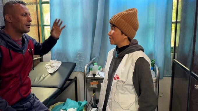 爆撃で両脚を骨折した患者と中池さん(提供:国境なき医師団)