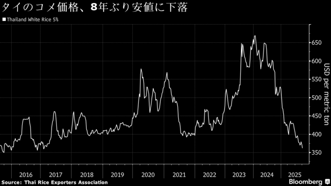 アジアの指標となるタイのコメ価格は最近、8年ぶりの安値に下落した。最大輸出国であるインドでモンスーン期の作付けが順調なことが背景にある。国連食糧農業機関(FAO)は2025-26年度の世界生産量が過去最高の5億5640万トンに達すると予測しており、在庫の積み増しにつながりそうだ。