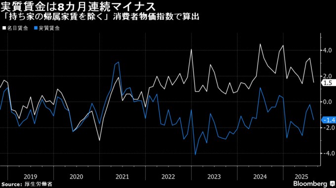 (ブルームバーグ):物価変動を反映させた実質賃金は8月に、8カ月連続のマイナスとなった。賞与の押し上げ効果が剥落し、名目賃金の伸びが鈍化した。所得改善の実感が乏しい中、政府に対し物価高への早急な対応を求める声が強まる可能性がある。