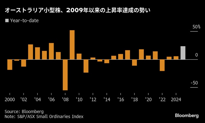 ASX小型株指数は年初来で約24%上昇。同国の優良株で構成されるS&P/ASX200指数に比べ2倍余りの上昇率となっている。小型株指数を構成する198銘柄のうち、20銘柄が100%以上値上がりした。