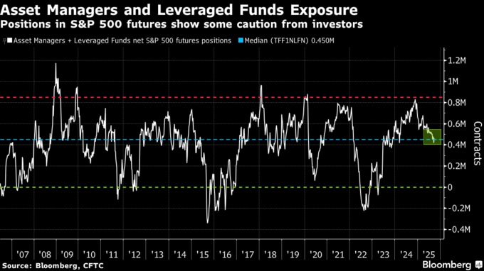 JPモルガンの同ストラテジストらによれば、米株先物の投機的ポジションは長期的な中央値に比較的近い水準にある。2024年から25年1-3月(第1四半期)にかけては中央値を大きく上回る水準が続いていたという。株価が最高値圏で推移しているにもかかわらず、全体的なエクスポージャーが過去の平均並みにとどまり、過度な拡大は見られない。