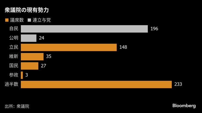 自公連立が崩壊した場合でも、首相指名選挙で自民会派の衆院議席196を上回る勢力が一致しなければ高市氏が首相に選出される。