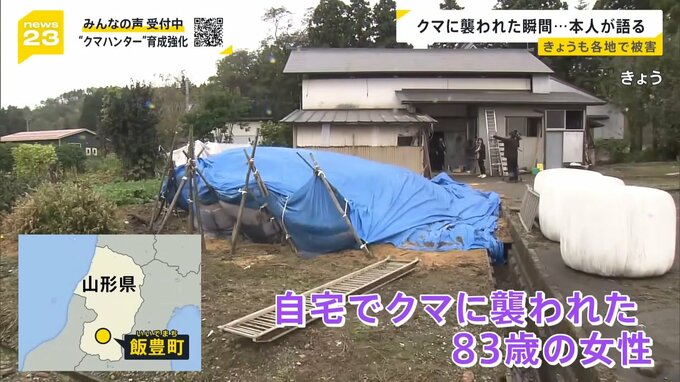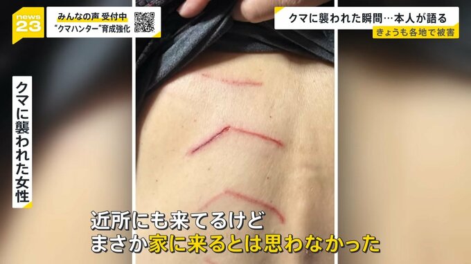 13日早朝、山形県飯豊町の自宅で、牛のエサの準備中にクマに襲われた83歳の女性。女性の腕には包帯がまかれ、背中には爪の痕が生々しく残っています。