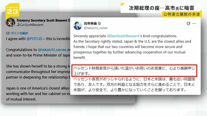 その高市氏に対し、アメリカのベッセント財務長官は…