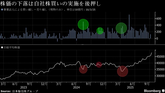 三菱UFJモルガン・スタンレー証券の大西耕平上席投資戦略研究員は、株価の上昇局面では企業が高値で買うことを嫌うケースはよくあると指摘。逆に株価が下がれば自社株買いをしやすくなり、「下値を支える主体として機能する」と話した。
