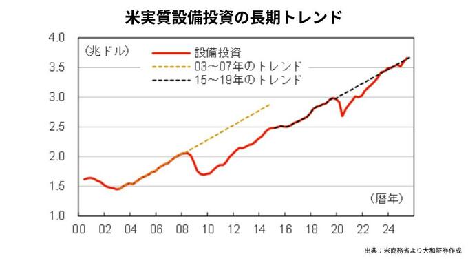 むろん、設備投資には濃淡がある可能性が高く、いずれかのタイミングで局所的にAI投資の一巡が指摘される可能性は高い。しかし、設備投資全体としては過剰とは言えない。