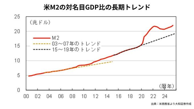パウエル議長の講演や最近のFRBのスタンスを考慮すると、今後はマネーサプライが緩やかに増加し、名目GDPに対するM2の比率も緩やかに高まっていくだろう。警戒感は高まりながらも、緩和的な金融政策が実体経済を支える構図(フィードバック・ループ)が続くと予想される。