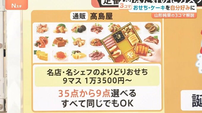 大手百貨店の「高島屋」が通信販売している「名店・名シェフのよりどりおせち」は、9マスで1万3500円からです。35点の料理から自分好みで9点選べるということです。