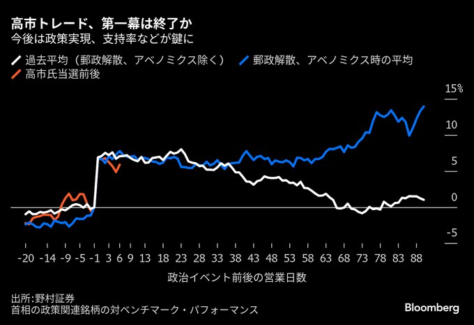 須田氏は、過去の事例からは株式市場で政策期待が最初に盛り上がった後、数カ月間は値固めする傾向がうかがえると指摘。期待だけでは買い続けることはできないため、当面はさらなるアウトパフォームを期待しにくく、「初動の1、2週間で大きく上げた後は高原状態が数カ月続きやすい」との見方を示す。