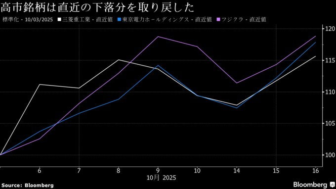 防衛関連の三菱重工業や核融合関連のフジクラ、原子力発電関連の東京電力ホールディングスなどの株価は足元で騰勢を強め、自公連立の解消を嫌気した週初の下げ分を取り戻した。