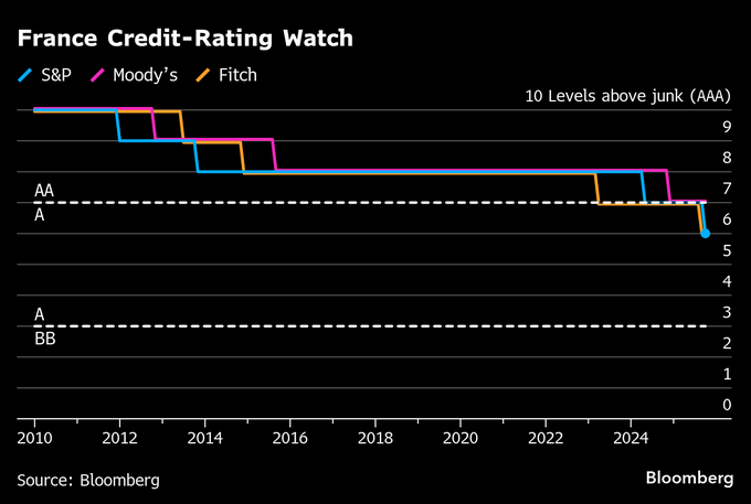 同社は、フランスの格付けを「AA-」から「A+」に引き下げた。2025年予算案が提出されたものの財政の不確実性が「依然として高い」と指摘した。