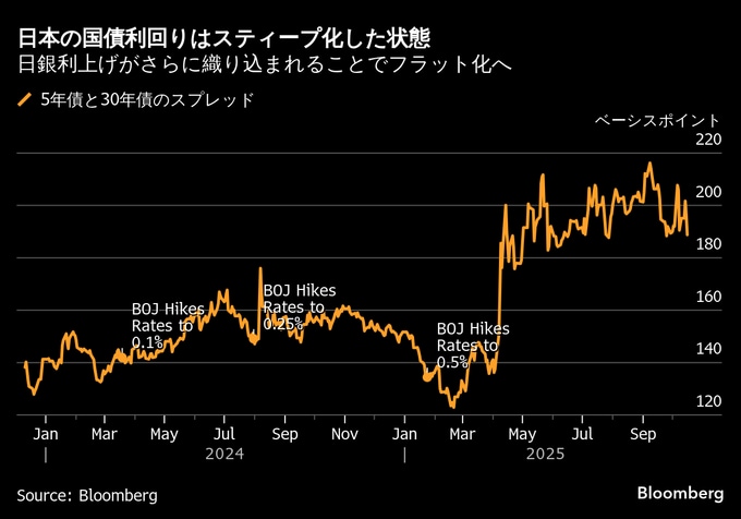 現在、5年債と30年債の利回り格差は約190ベーシスポイント(bp、1bp=0.01%)。先月には、20年前までさかのぼるデータで最大の216bp前後まで拡大していた。これは、1月の利上げ前に見られた約140bpを大きく上回り、次の引き締め局面に向け、格差縮小の余地があることを示している。