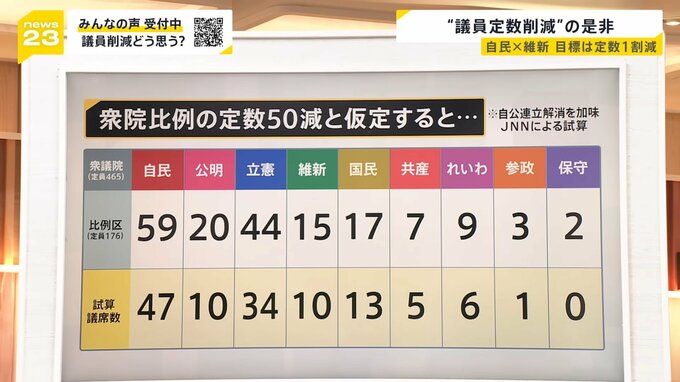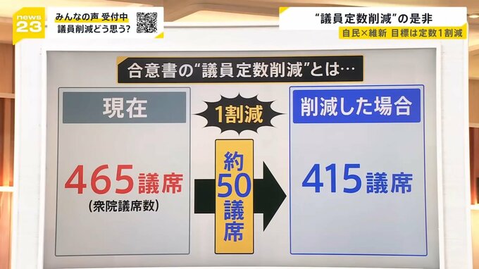 今回交わされた連立の合意書の中に「議員定数の削減」がありますが、これを自民党と日本維新の会は「衆議院の定数を1割を目標に削減する」という内容を記しました。計算すると、現在の衆議院460議席から約50議席が減る計算になります。