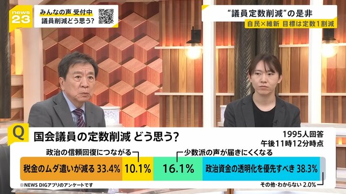 Q.国会議員の定数削減についてどう思う?(※NEWS DIGアプリのアンケート 午後11時12分時点 1995人回答)