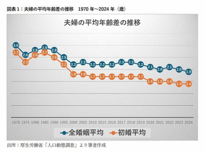2024年の婚姻統計を参照すると、結婚の76%を占める初婚同士の結婚の平均年齢差はわずか1.4歳である。