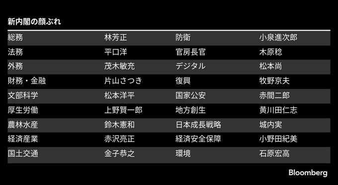 内閣の要となる官房長官に木原稔前防衛相を起用。自民党総裁選を争った茂木敏充元幹事長を外相、小泉進次郎農相を防衛相、林芳正官房長官を総務相に充て挙党体制構築に務めた。さらに赤沢亮正経済再生担当相を経済産業相とする。維新からは遠藤敬国対委員長を連立合意政策担当の首相補佐官として迎えた。