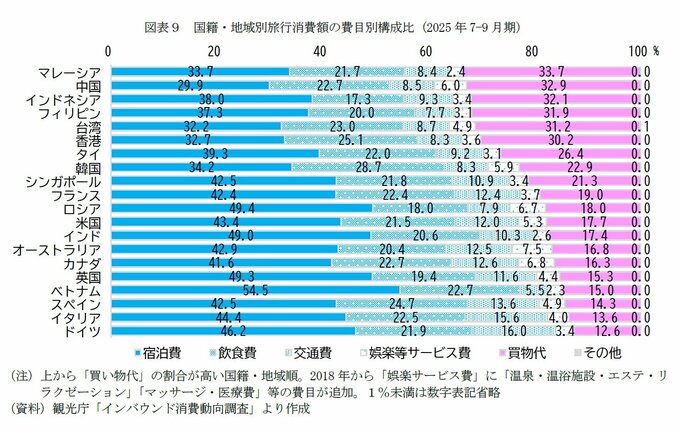 今期の象徴的な変化は、中国の「買い物代」比率が初めて首位から陥落したことだ。前期の39.9%から今期は32.9%へと低下し、マレーシアに次ぐ2位となった。