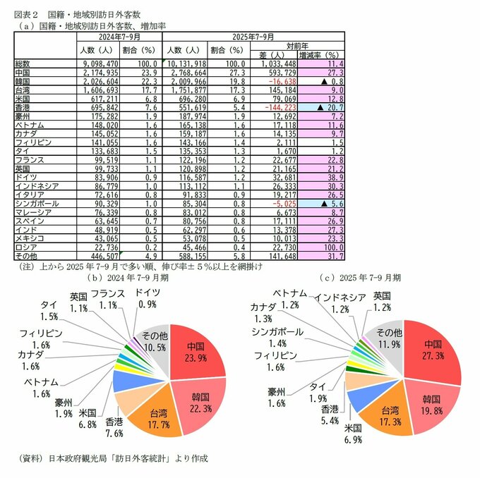 国籍・地域別では、中国が約277万人(全体の27.3%)で首位となり、韓国(約202万人、19.8%)、台湾(約175万人、17.3%)が続く。