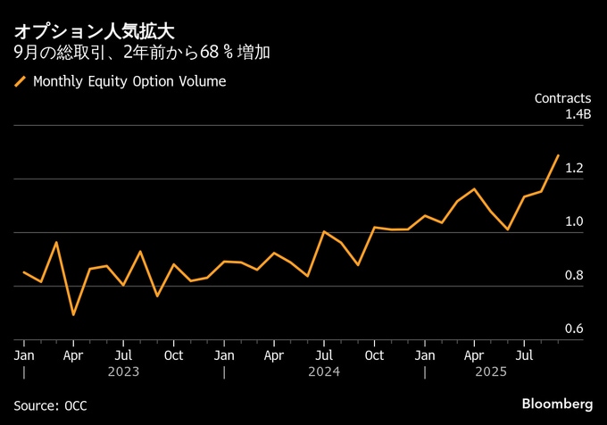 ここ数年、個人投資家が増え、24時間以内に満期となるゼロデーオプション(0DTE)の人気が高まり、株式オプションの取引量が急増している。オプション決済機関のオプションズ・クリアリングのデータによると、9月の取引量は12億9000万枚と、2年前の7億6300万枚から68%増加した。