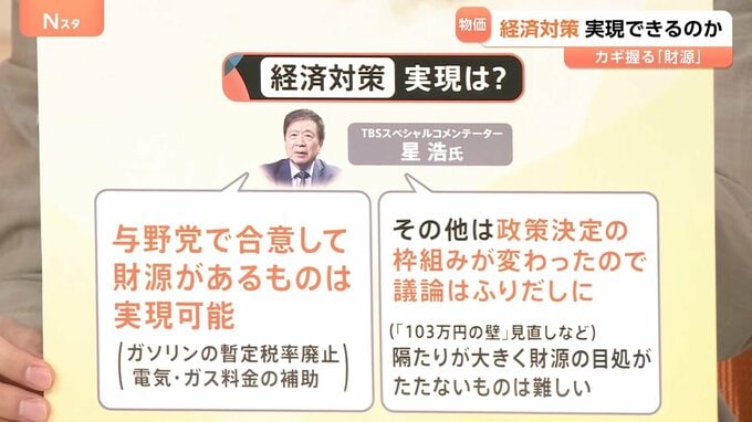 その辺りはまだ不透明な中で、TBSスペシャルコメンテーターの星浩さんは「きのう(21日)の高市総理の会見は『項目』を並べただけ」とした上で、「与野党で合意して、財源があるもの(ガソリンの暫定税率廃止、電気・ガス料金の補助)は実現可能」と、ここは早急に話が進むだろうとみています。