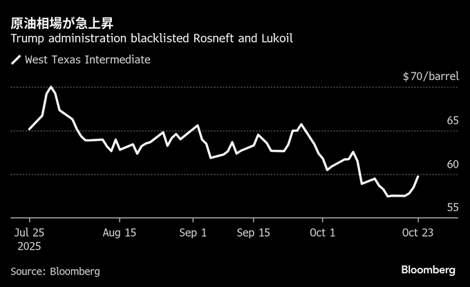 原題:Oil Jumps After US Sanctions Russia’s Rosneft and Lukoil(抜粋)