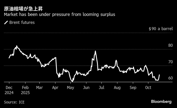 北海ブレント先物12月限はロンドン時間23日午前11時55分(日本時間午後3時40分)時点で5.2%上昇し65.84ドル。WTI先物12月限は5.7%高の61.81ドル。